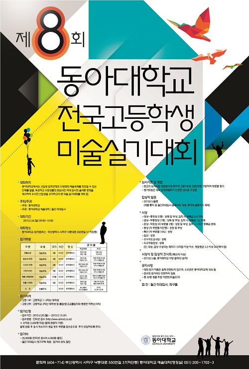 동아대와 월간 미대입시가 주관하는 이번 대회는 수험생들의 관심사인 미대 입시의 올바른 방향을 제시해 우수한 신입생을 유치하고자 마련됐다. 동아대는 이번 대회를 통해 예술세계를 창조할 수 있는 인재를 발굴, 육성하고 동아대 신입생 입학전형의 다양화를 도모할 계획이다.