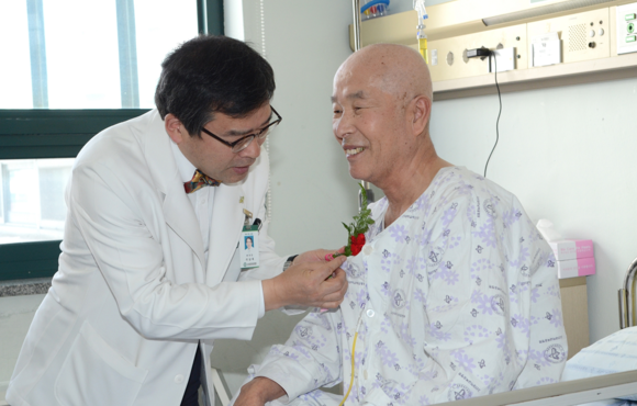 ▲이상욱 고신대복음병원장이 8일 어버이날을 맞아 입원 중인 어르신께 직접 카네이션을 달아드리고 있다. (사진제공=고신대복음병원)