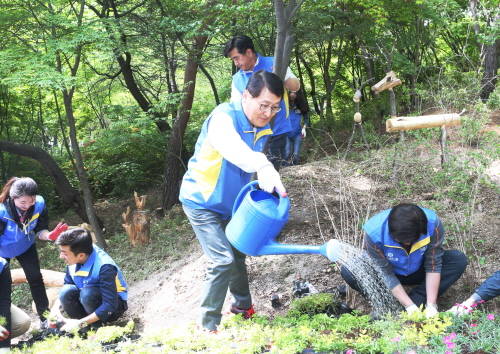이날 신한카드 봉사단은 구역별 3개조로 꽃과 나무를 심었다. 이들은 안전하고 즐겁게 자연을 체험할 수 있는 친환경 공간을 마련한다는 생각으로 직급 구분 없이 구슬땀을 흘렸다.