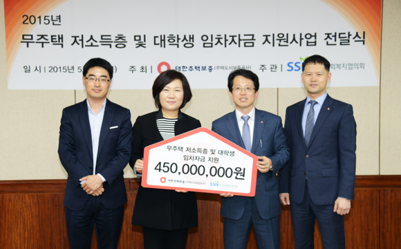 (CNB=최원석 기자) 대한주택보증(사장 김선덕)이 8일 ‘무주택 저소득층 및 무주택 대학생을 위한 임차자금 전달식’을 갖고 총 4억5천만원을 한국사회복지협의회에 전달했다.