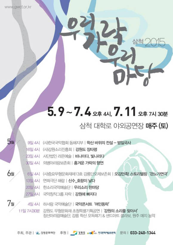 (CNB=최성락 기자) 삼척시는 강원문화재단에서 주관하는 2015 우리가락 우리마당 공연이 오는 9일부터 매주 토요일 삼척 대학로 야외공연장에서 열린다고 8일 밝혔다.