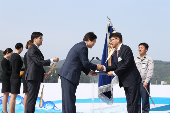 ▲8일 거제시 구조라항에서 열린 '제3회 바다식목일' 행사에서 김영석 해양수산부 차관(왼쪽)이 대우조선해양 인사지원실장 유인상 전무(오른쪽)에게 대통령 표창을 대리 수여하고 있다. (사진제공=대우조선해양)