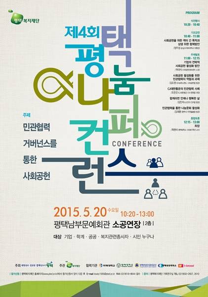 (재)평택복지재단(이사장 공재광)은 제4회 평택나눔 컨퍼런스를 오는 20일 오전 10시20분, 평택남부문예회관 소강당에서 민.관협력 거버넌스를 통한 사회공헌이라는 주제로 개최한다.