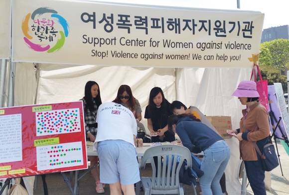 수원시 아동․여성안전 지역연대의 여성폭력피해자 지원기관들이 지난 10일 수원 제1야외음악당에서 열린 다문화 한가족 축제에서 여성폭력피해자 지원 홍보 캠페인을 펼쳤다.