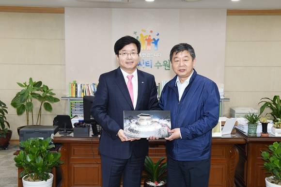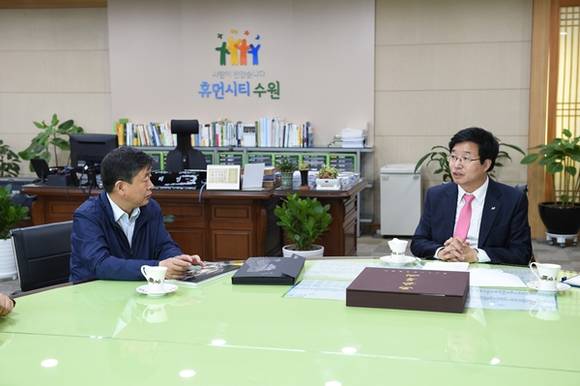 한국의 관광공사에 해당하는 섬서성 화산여유그룹유한공사의 당서기인 장천 등 관계자 9명은 오전 수원시청을 방문하여 염태영 수원시장과 면담을 가졌다.