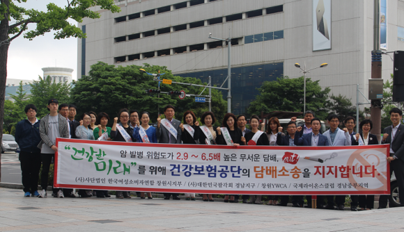 캠페인은 건보공단이 제기한 담배소송의 4차 변론일(5/15)을 하루 앞두고 국민들에게 흡연 피해에 대한 경각심을 고취시키고, 담배로 인한 질병의 원인 제공자인 담배회사에 책임을 묻는 공단의 담배소송을 지지하기 위해 경남지역 소비자·시민단체에서 마련했다.