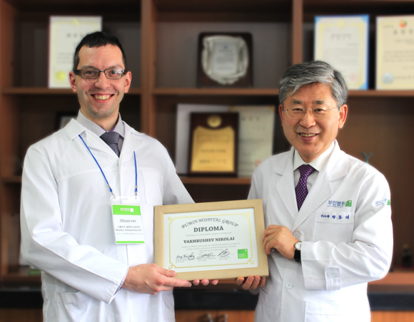 ▲부민병원 해외 의사 연수에 참가한 러시아 정형외과 의사 바흐루셰프 니꼴라이씨(왼쪽)가 정흥태 부민병원 이사장에게 수료증을 받고 기념촬영을 하고 있다. (사진제공=부민병원)