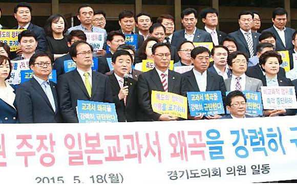 경기도의회(의장 강득구)는 18일 도의회 현관에서 일본의 문부과학성이 발표한 중학교 교과서 검정 결과와 관련하여 일본의 역사 왜곡에 대해 강력히 규탄하며 교과서 검정 결과를 즉각 철회할 것을 촉구하였다.