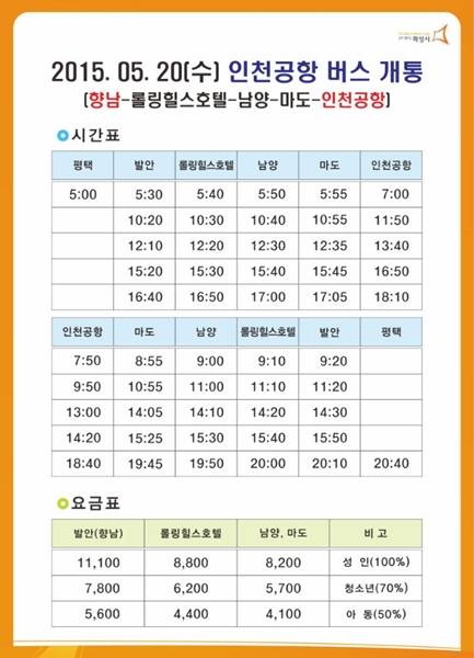 첫차는 향남터미널을 기준으로 오전5시 30분이고 막차는 오후 4시 40분에 출발한다. 인천공항까지 약 1시간 30분 소요되며 요금은 성인기준 향남에서 인천공항까지 1만1100원이다.