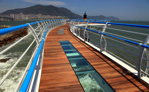 해상산책로는 또 송도 앞 바다의 아름다운 자연풍광을 바다 한 가운데서 조망하면서 여유롭게 휴식을 취할 수 있는 여가공간으로 조성됐으며, 바다 위를 걷는 기분을 느낄 수 있도록 바닥 일부를 투명 강화유리와 매직그레이팅(철제망)으로 만들었는데 높이 9.3m의 다리 아래로 푸른 파도가 넘실거리는 아찔한 풍경을 보면서 짜릿한 스릴과 재미를 만끽할 수 있다.