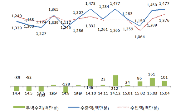 19일 부산세관이 발표한 ‘2015년 4월 부산지역 수출입 동향’에 따르면, 전년동월 대비 수출은 19.2% 증가한 14억7700만 달러, 수입은 3.5% 증가한 13억7600만 달러를 기록하며 무역수지 1억100만 달러 흑자를 기록했다.