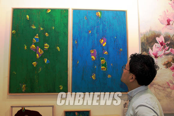 ▲20일 오후 서울 삼성동 코엑스에서 진행중인 2015 서울오픈아트페어 현장에 설치된 권시숙 작가의 작품을 관람객이 감상하고 있다.(사진=왕진오 기자)