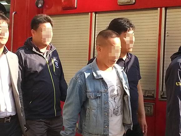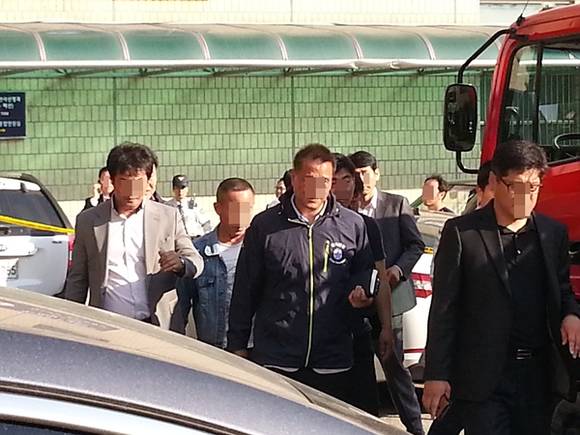 ▲20일 수원지법에서 투신소동을 벌이던 50대 후반의 피의자가 스스로 옥상에서 내려와 경찰에 연행되고 있다.