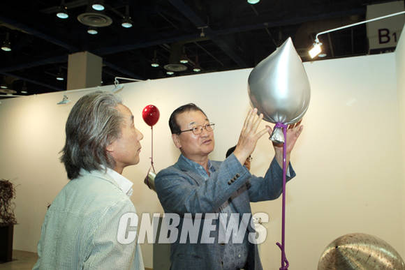 ▲20일 서울 삼성동 코엑스에서 진행된 2015 서울오픈아트페어 개막식에 함께한 윤영달 크라운해태제과 회장(사진 우측)이 전시된 작품을 살펴보고 있다.(사진=왕진오 기자)