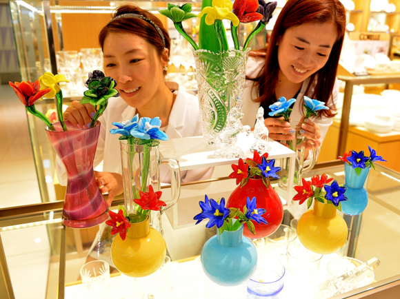 홈데코 상품에 대한 관심이 나날이 증가하는 가운데, 롯데백화점 부산본점 6층 크리스탈렐리아 매장에서는 유리 소재로 만든 다양한 컬러의 꽃 모형을 선보여 여성고객들이 살펴보고 있다. (사진제공=롯데백화점 부산본점)