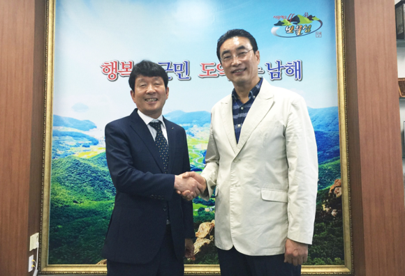▲왼쪽부터 김영식 천호식품 대표, 박영일 남해군수. (사진제공=천호식품)