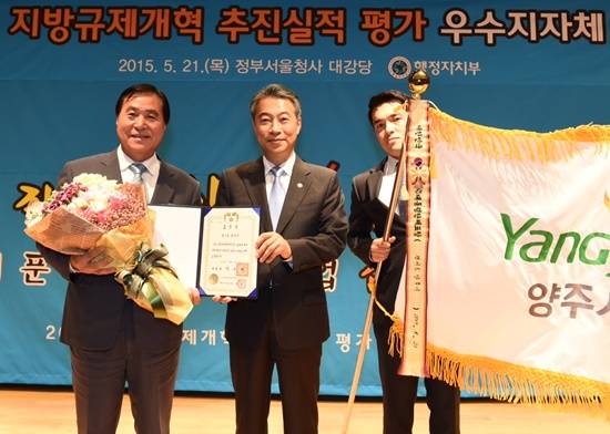 양주시가 행정자치부에서 실시한 2014 지방규제개혁 추진실적 평가에서 최우수기관으로 선정돼 21일 정부서울청사에서 대통령 표창을 2회 연속 수상하는 쾌거를 올렸다.