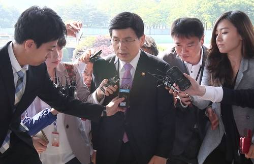 ▲국무총리로 내정된 황교안 법무부 장관이 22일 오전 정부과천청사로 출근하다 취재진으로부터 질문을 받고 있다.(사진=연합뉴스)