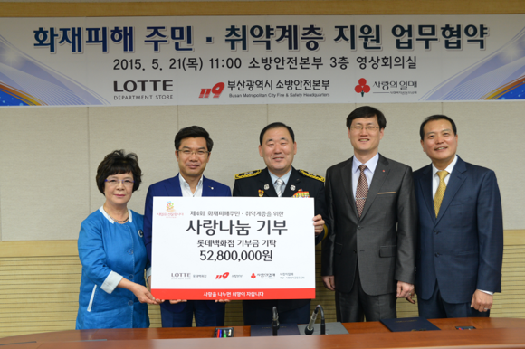 이를 위해 부산지역 롯데백화점은 부산소방본부 3층 회의실에서 부산소방본부, 부산사회복지공동모금회와 함께 화재에 취약하고 직접 피해를 입어 생계가 어려운 시민을 위해 '119안전기금' 상호 업무협약(MOU)식을 21일 체결했다.