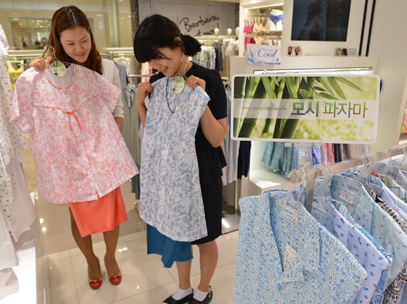 여름을 앞두고 유통업계가 관련 상품을 대대적으로 준비하고 있는 가운데, 롯데백화점 부산본점 3층 '비비안' 매장에서는 여름철 숙면을 위한 '모시 파자마'를 선보여 여성고객들이 살펴보고 있다. 이 상품은 기존의 파자마와 달리 감각적인 컬러와 귀여운 디자인으로 젊은층에게 큰 호응을 얻고 있다. (사진제공=롯데백화점 부산본점)