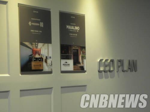 ▲현대카드의 CEO플랜이 새로운 퇴직문화를 제시해 눈길을 모으고 있다. CEO라운지 입구에 게시돼 있는 창업 1호점과 2호점 포스터. (사진=이성호 기자)