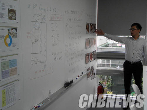 ▲강경식 현대카드 창업지원팀 과장이 CEO랩 화이트보드 앞에서 설명하고 있다. (사진=이성호 기자)
