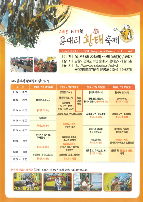 또 축제 기간 내내 황태포 만들기 체험, 황태 투호 체험, 황태 껍질 벗기기 등 황태와 관련된 각종 체험행사와 관광객의 입맛을 사로잡는 무료 시식회 등 다양하고 풍성한 행사가 펼쳐진다.