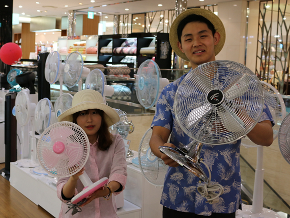 최근 무더운 여름 날씨가 기승을 부리는 가운데, 롯데백화점 센텀시티점 7층 생활가전 매장에서는 30여종에 이르는 다양한 종류의 선풍기를 선보여 매장 직원들이 상품을 살펴보고 있다. (사진제공=롯데백화점 센텀점)