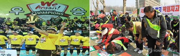 ▲저축은행 두 얼굴. 대부업계 저축은행인 OK저축은행은 공격적인 대출영업으로 1년 새 자산이 3배 가까이 불었다. 지난달 1일 프로배구 V리그 남자부 결승전에서 챔피언 자리에 오른 OK저축은행 선수들이 우승 트로피를 들고 기뻐하고 있다. 지난 2011년 저축은행사태 당시 부산저축은행 계열사 예금피해자들이 서울 서초구 서초동 대검찰청 앞에서 항의집회를 열고 있다. (사진=CNB포토뱅크, 연합뉴스)
