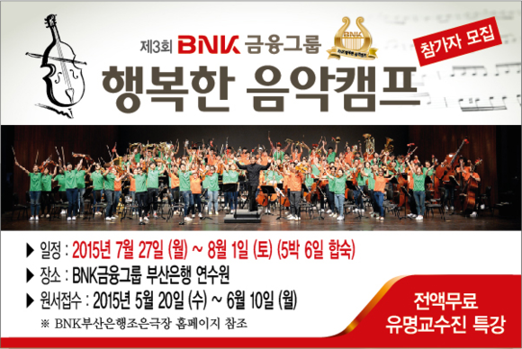 BNK금융은 젊은 음악인의 재능과 역량을 개발하는 교육문화 나눔 사업인 ‘BNK 행복한 음악캠프’를 오는 7월 27일부터 5박 6일간 부산은행 기장 연수원에서 진행한다고 26일 밝혔다.