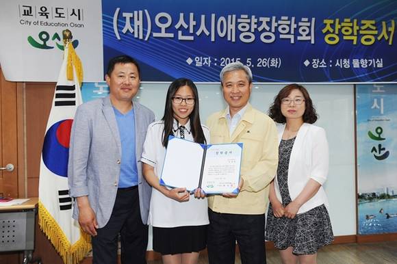 오산시 애향장학회(이사장 곽상욱 오산시장)는 지난 26일 시청 물향기실에서 2015년 애향 장학생으로 신규 선발된 대학생과 고등학생에게 장학증서를 수여했다.