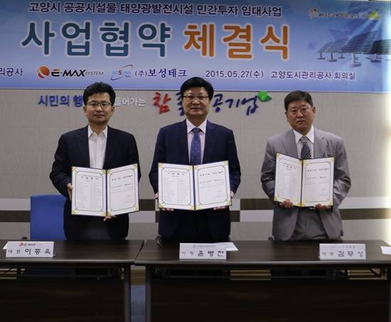 고양시(시장 최성)와 고양도시관리공사(사장 윤병천)는 27일 공사 회의실에서 '고양시 공공시설물 태양광발전시설 민간투자 사업'을 위한 우선협상대상자와의 사업협약체결행사를 개최했다고 밝혔다.
