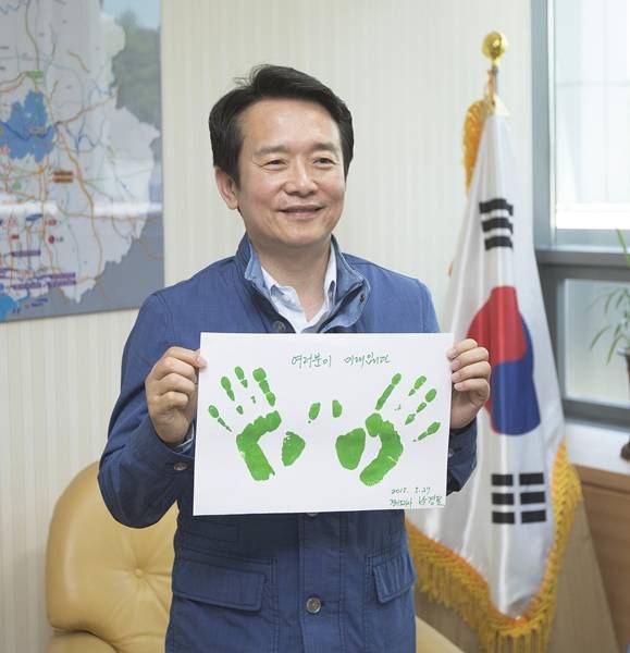 남 지사는 27일 중소기업센터에서 쇼오브핸즈 행사에 동참하기 위해 핸드프린팅을 진행했다.