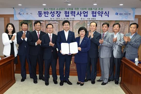 수원시와 IBK기업은행은 28일 수원시청 상황실에서 관내 중소기업과 소상공인 공동지원을 위한 동반성장 협력사업 협약을 체결했다.