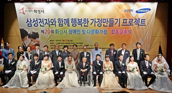 올해 20회를 맞는 합동결혼식은 행복한 가정 만들기 프로젝트의 하나로 화성시와 삼성전자가 후원한다. 올해는 경제적 어려움으로 결혼식을 미뤄 온 장모씨 등 6쌍의 장애인·다문화 가정이 결혼식을 올렸다.