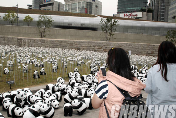 ▲5월 29일 서울 동대문디자인플라자(DDP) 장미정원에서 재활용 종이로 제작된 1600마리 수공예 빠삐에 마쉐 판다의 플래시몹 행사가 열렸다. (사진=왕진오 기자)