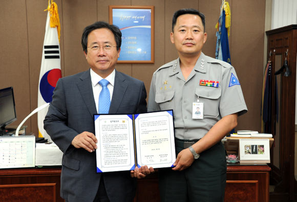 부산시교육청과 육군본부가 2일 오전 11시 시교육청에서 김석준 부산시교육감과 육군본부 인력획득계획홍보과장 조홍득 대령 등 양측 관계자들이 참석한 가운데 진로교육 지원을 위한 업무협약을 체결했다. (사진제공=부산시교육청)