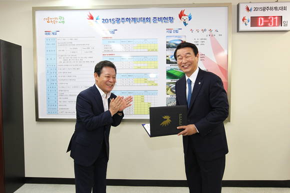 ▲광주U대회 조직위원회 윤장현⋅위원장이 2일 오전 광주U대회 선수촌장 위촉식을 갖고,임덕호 전 총장에게 선수촌장 위촉장을 전달하고 있다.<사진=광주광역시>
