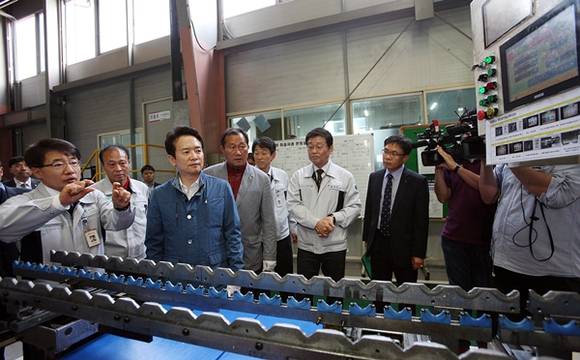 ▲2일 오후 기업애로 해소차 찾은 평택 어연한산산업단지 내 (주)서진캠에서 남경필 경기도지사가 임영호 사장으로부터 캠샤프트 설명을 듣고 있다.(사진=경기도)