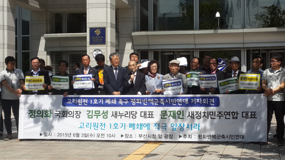 평화반핵군축시민연대는 3일 오전 10시 부산시청 광장에서 기자회견을 열고, 오는 18일 2차 수명연장 신청에 들어가는 고리1호기의 폐쇄와 관련해 지역 출신 김무성 새누리당 대표와 문재인 새정치민주연합 대표, 정의화 국회의장이 시민들을 대변해 앞장서 줄 것을 강력히 촉구했다.