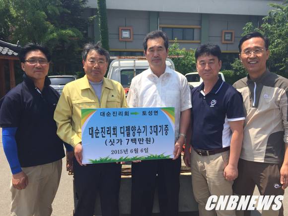 지난 6일 토성면 신평리 소재 금강산 대순진리회(총무부장 전경진)는 신평벌 360,000평이 극심한 가뭄으로 모가 타들어가자 700만 원 상당의 디젤 양수기 3대와 호수 2km 미터를 토성면(면장 김창인)에 기증했다. 아울러 대순진리(일 2000통)와 포유레저(일 500통)의 지하수를 신평벌로 제공하기로 했다.