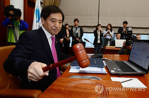 ▲지난 5월 15일 이주열 한국은행 총재가 금융통화위원회의를 시작하며 의사봉을 두드리고 있는 모습. (사진=연합뉴스)