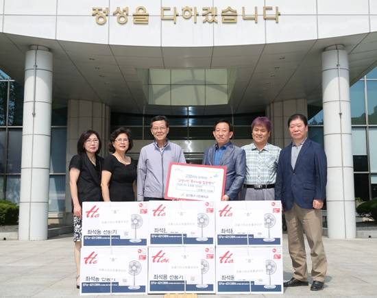 ▲라페스타 쇼핑몰 관리단 이수동 회장(좌측 3번째)가 이경제 일산동구청장(우측 세번째)에게 소외계층을 위한 선풍기 15대를 기증하고 있다. (사진= 일산동구청)