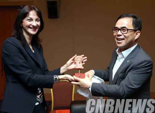 ▲11일 서울 강남구 삼성동 코엑스에서 엘레나 콘투라(Elena Kountoura) 그리스 관광부 장관이 김종 문화체육관광부 제2차관(사진 우측)에게 그리스 전통 공예품을 선물로 주고 있다.(사진=문화체육관광부)