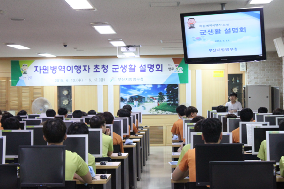 부산지방병무청(청장 김태화)은 지난 10일부터 12일까지 징병검사장에서 징병검사 수검자 300여명을 대상으로 자원병역이행자 초청 군생활 설명회를 가졌다.