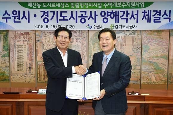 수원시는 15일 수원시청 상황실에서 경기도시공사와 매산동 도시르네상스 주택개보수 지원사업 추진을 위한 업무협약을 체결했다.