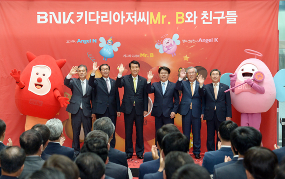 BNK금융은 15일 오전 부산은행 문현동 본점에서 新 CI인 ‘’ 제막식을 가지고 사회공헌형 캐릭터인 'Mr.B'와 'Angel K'를 런칭했다.
