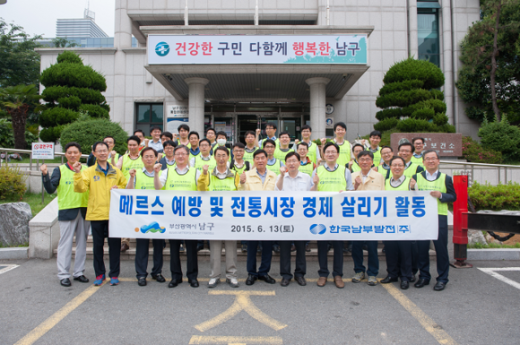 한국남부발전(주)(사장 김태우) 임직원 40여명과 부산 남구청 임직원 20여명은 지난 13일 최근 전국적으로 확산되고 있는 중동호훕기증후군(메르스)의 조기 종식을 위해 전통시장을 방문하여 시민들의 불편사항을 듣고 메르스 퇴치를 위한 예방활동을 전개했다.