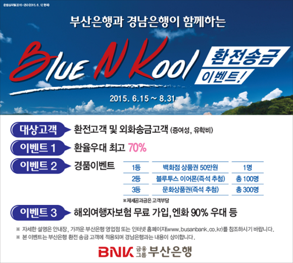 BNK금융그룹(회장 성세환) 부산·경남은행은 여름 휴가시즌을 맞아 8월 말까지 ‘Blue N Kool’ 환전송금 이벤트’를 공동으로 실시한다고 16일 밝혔다.