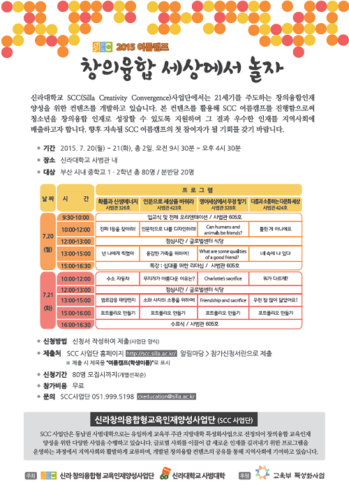 신라대학교(총장 박태학) 신라창의융합형 교육인재양성사업단(SCC: Silla CreativityConvergence Education Institute)은 여름방학을 맞아 중학생을 대상으로 '창의융합 세상에서 놀자'란 타이틀의 캠프를 마련한다고 16일 밝혔다.